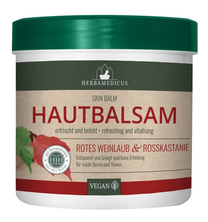 Herbamedicus balzāms ķermenim ar sarkano vīnogu lapu un zirgkastaņu ekstraktu ir īpaši izstrādāts līdzeklis nogurušu kāju un vēnu kopšanai. Tā sastāvā esošie augu ekstrakti palīdz uzlabot asins cirkulāciju, stiprināt asinsvadu sienas un mazināt smaguma sajūtu kājās. Balzāms sniedz atsvaidzinošu un relaksējošu efektu, vienlaikus kopjot un mitrinot ādu.