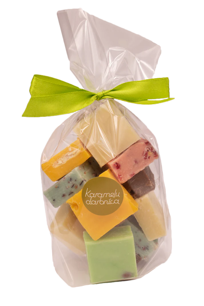 Sastāvdaļas: Šokolāde (kakao masa, cukurs, vājpiena pūlveris, pilnpiena pulveris emulgators, sojas lecitīns, dabīgs aromatizētājs vaniļa) , iebiezinātais piens, aromatizētājs, dehidretas ogas, kokosa skaidiņas, riekstu pasta, pipermētru pasta. SATUR LAKTOZI, SOJU, RIEKSTUS.