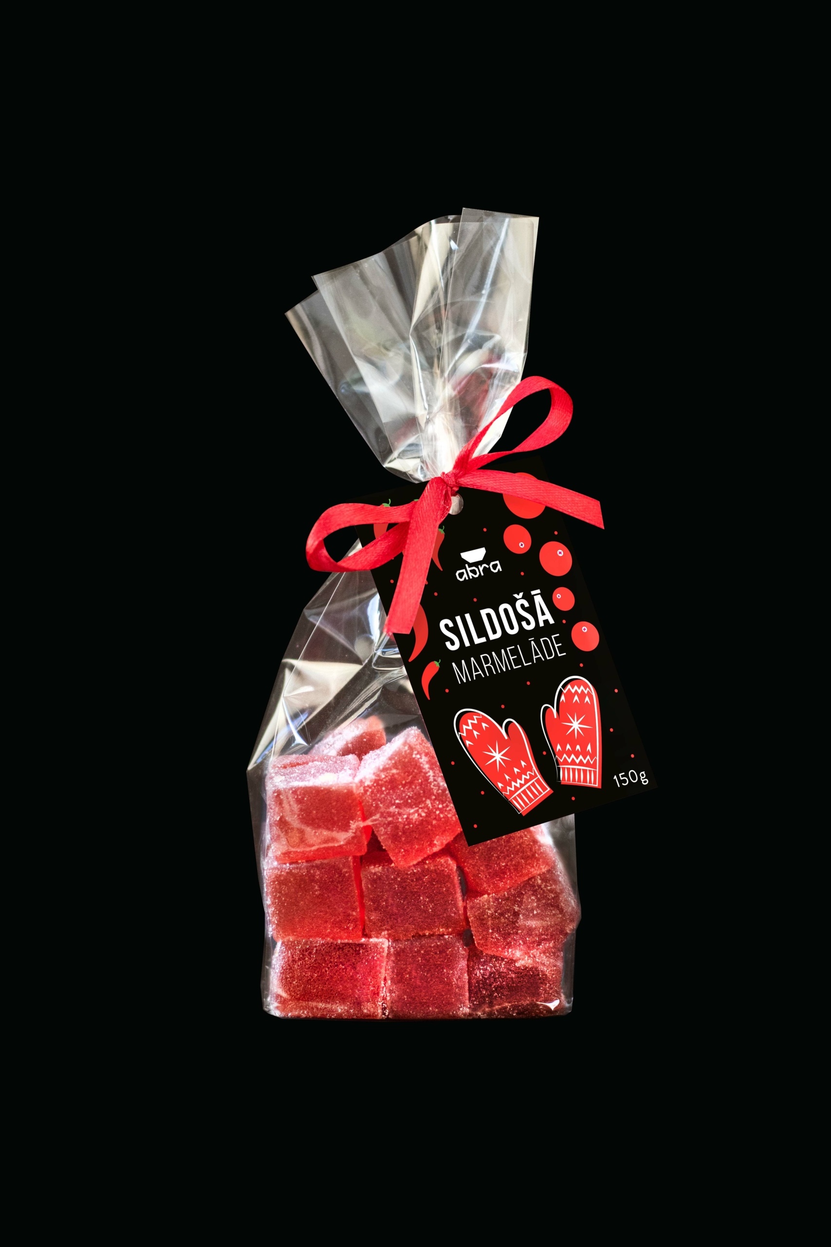 Sastāvdaļas: cukurs, glikozes sīrups, dzērveņu sula, pektīns (recinātājs), citronskābe (skābuma regulētājs), kajenas pipari, dekstroze.